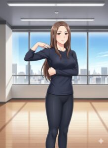 - 姿勢をセット:まっすぐに立ち、右肩に右手、右肋骨に左手を添えます(イラストのポーズ)
